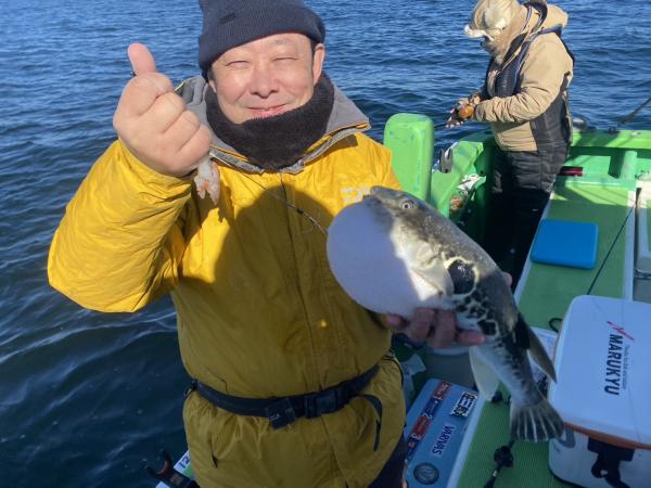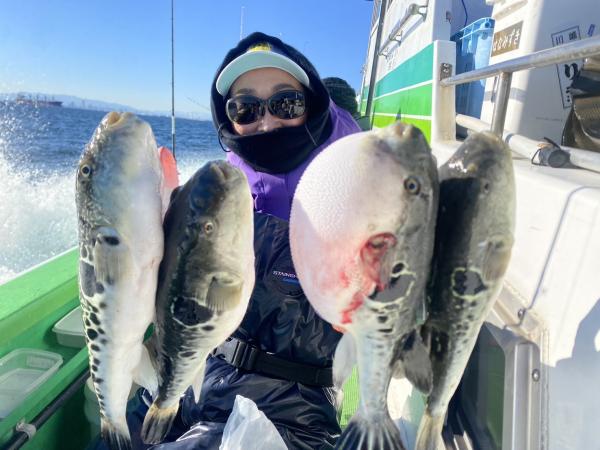 4匹2名様で1名様はトラフグ初挑戦の女性の方で丁寧な誘いでコンスタントにアタリ出てました、もう1名様は後半から4匹GET!